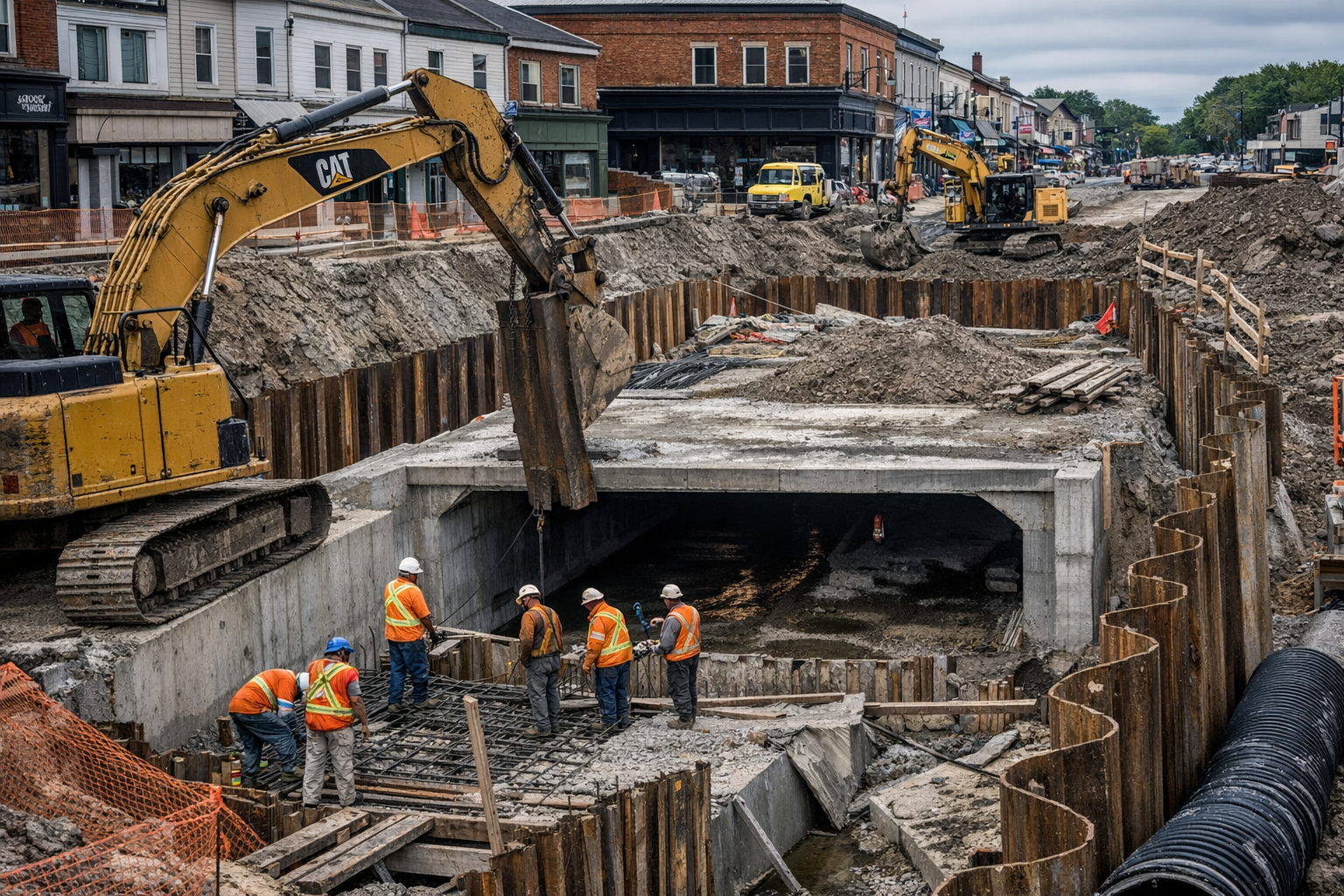 The Brock Street culvert project Uxbridge was designed to significantly reduce flood risk in the downtown area. Prior assessments warned that severe storms could leave Brock Street submerged under several feet of water. With the new twin-channel culvert in place, most of the downtown core has now been removed from the floodplain, allowing for safer conditions and future development.