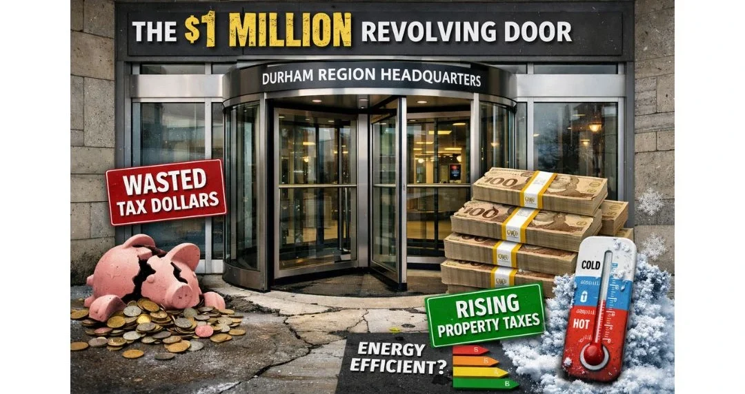 The Durham Region 1 Million Revolving Door installed at regional headquarters in Whitby is facing growing criticism over its cost and justification. The infrastructure project gained attention after media personality David Menzies and Pickering Councillor Lisa Robinson questioned how a single revolving door could cost taxpayers roughly $1 million.