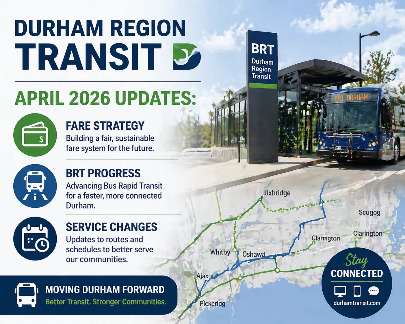 Durham Region Transit has released the highlights from its April 2026 Transit Executive Committee meeting, revealing major updates on fare modernization, rapid transit construction progress, and important service improvements that will directly impact commuters across all eight municipalities in Durham Region. The Durham Region Transit April 2026 updates cover a wide range of significant initiatives designed to improve the public transit experience for the growing number of residents who rely on DRT buses and transit services every single day to get to work, school, appointments, and other essential destinations.
