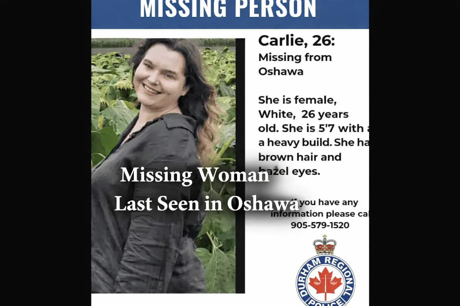 Durham Regional Police say Carlie, 26, was last seen on Thursday. Investigators have not yet released the exact time or specific location within Oshawa where she was last spotted. Authorities have stated they are concerned for her safety and are urging anyone with information to come forward as efforts to locate her continue.