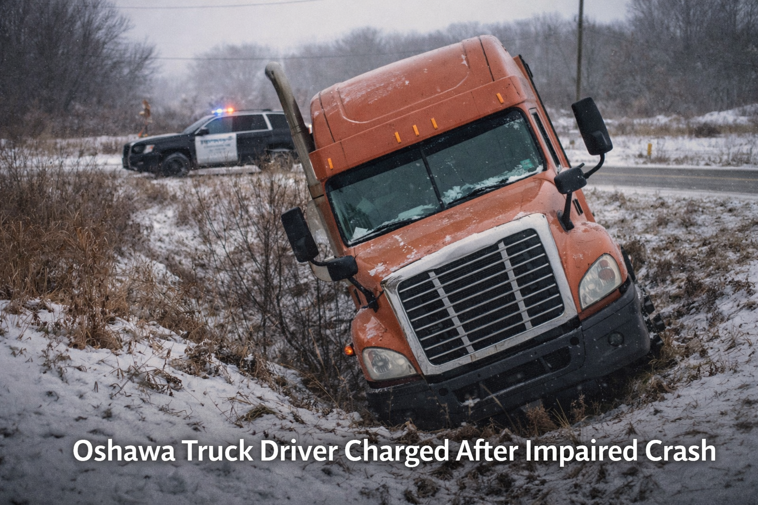 An Oshawa truck driver impaired driving charge has been laid after a transport truck crashed into a ditch in Puslinch Township, according to Ontario Provincial Police.