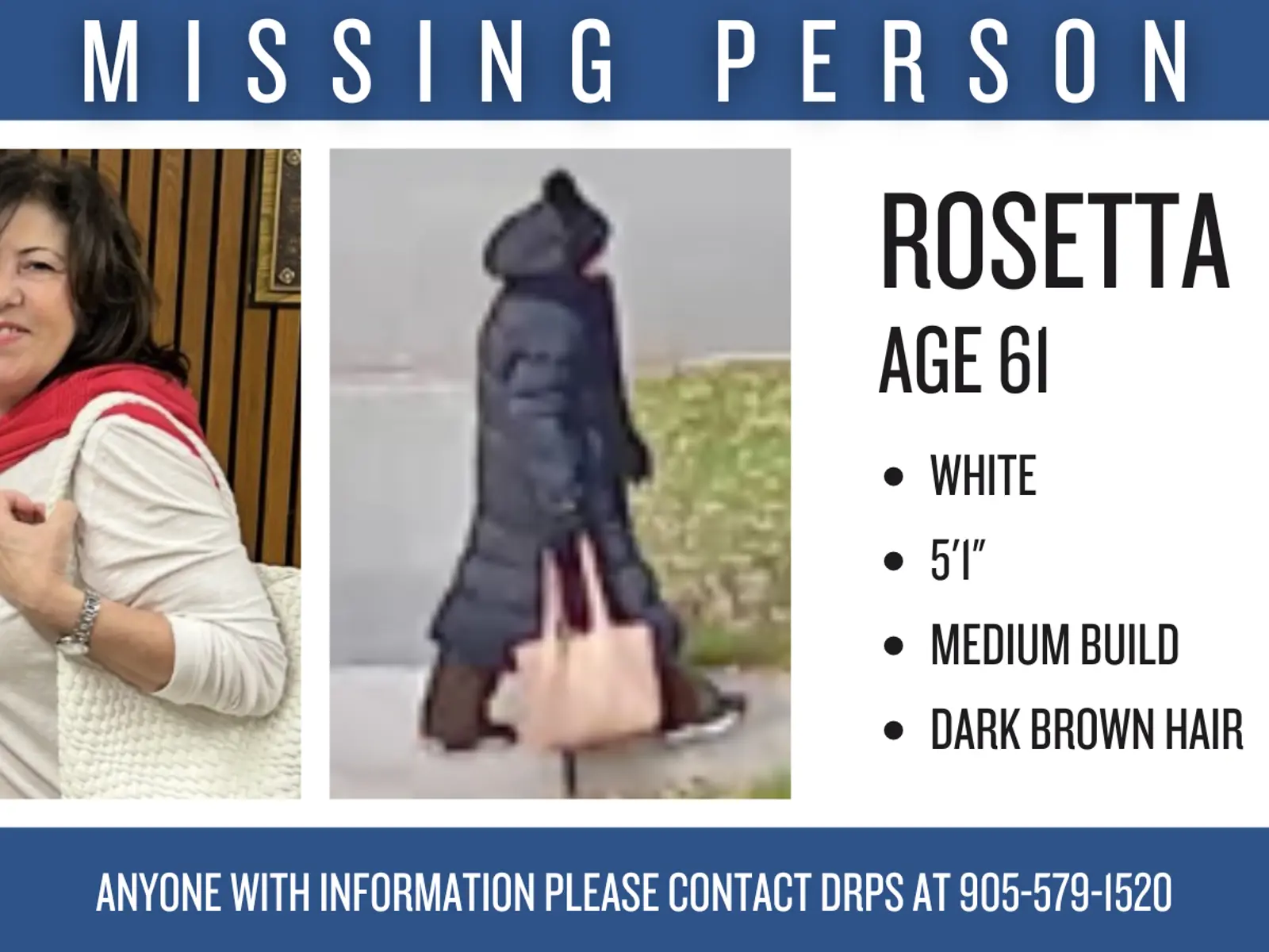At the time she was last seen, Rosetta was wearing a black toque, a long black trench-style winter coat, black pants, and black-and-white shoes. She was also carrying a light-coloured purse or tote bag.