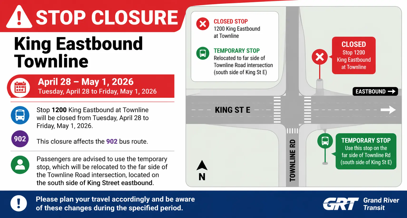 From Tuesday, April 28 to Friday, May 1, 2026, Stop closure King Eastbound Townline April 2026 will impact Stop 1200 King Eastbound at Townline. This closure affects the 902 bus route.