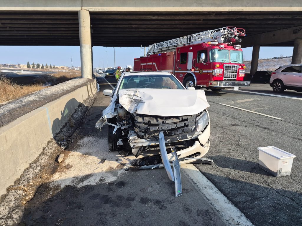 Shortly before 1 p.m., a wheel detached from a tractor trailer and struck a white sedan travelling in the westbound lanes near Brock Road. The impact severely damaged the vehicle, and the sedan’s driver was transported to hospital with injuries.